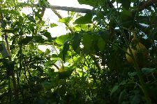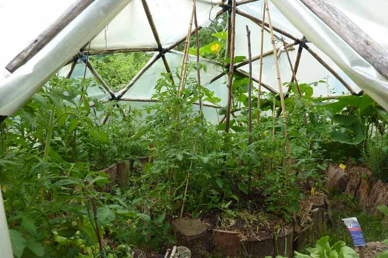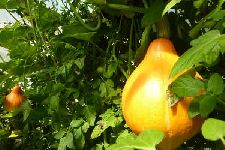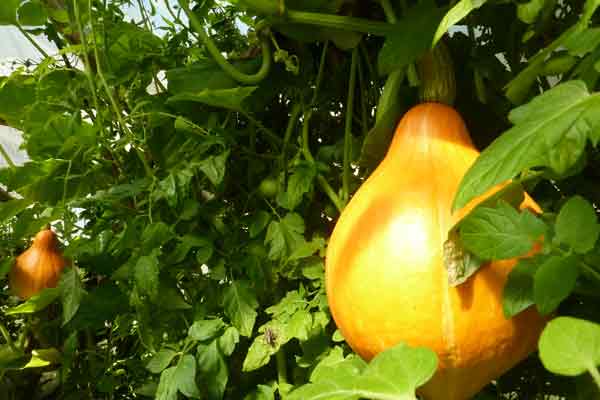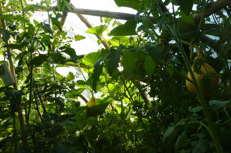 ... et en ce mois de juillet, la serre est une véritable forêt vierge de tomates. Le potiron géant déborde par la fenêtre et nous nous sommes déjà régalés de la douce saveur de ses fruits.
