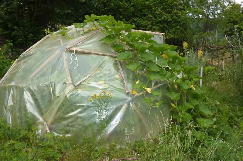 Il y a aussi quelques laitues, des boutures de rosier et de romarin, des carottes, des piments, une aubergine et un géant potiron grimpeur qui escalade les triangles et étire sa tige à l'extérieur.