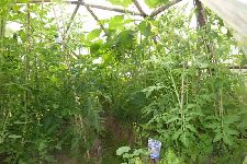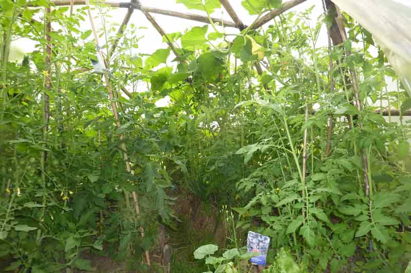 ... y croissent en ce mois de juin : karo, gruschovska, matina, marmande, cocktail, poire jaune. Certains plants sont en fleurs, d'autres portent déjà des fruits.